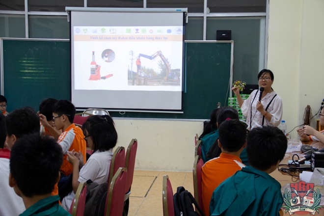 Cô giáo giới thiệu về thiết kế cánh tay robot điều khiển bằng thủy lực